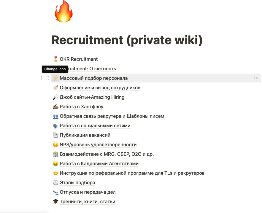 В Notion мы организовали внутреннюю базу знаний для рекрутеров и нанимающих менеджеров, где подробно описали процессы рекрутинга: