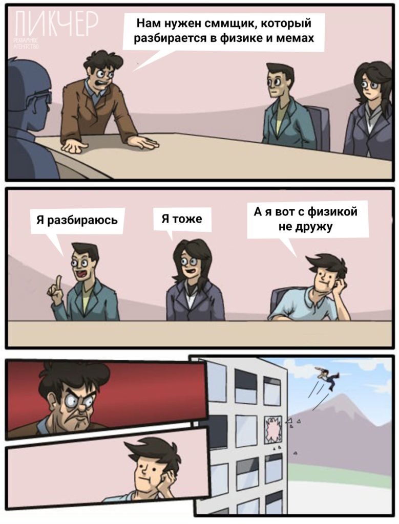 Например, когда мы искали эсэмэмщика, который разбирается в физике и мемах, мы разместили объявление в паблике «Образовач», где рассказывают о новостях науки. Внимание кандидатов мы привлекли мемом, иллюстрирующим вакансию: