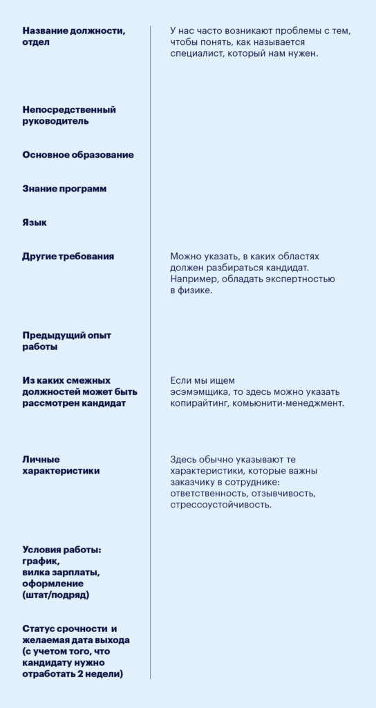 В Пикчере нанимающие менеджеры — тоже творческие ребята. Чтобы им было проще структурировать свой запрос, я предлагаю им заполнить подробный бриф в Notion: