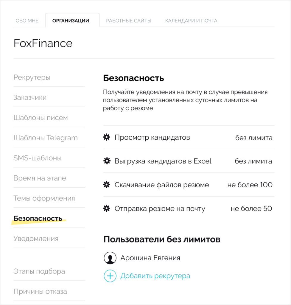 Установить лимиты можно в настройках вашего Хантфлоу (Настройки → Организации → Безопасность). В этом же разделе можно указать пользователей, которые могут работать с базой резюме без ограничений — например, если они занимаются аналитикой и им нужен полный доступ к базе.