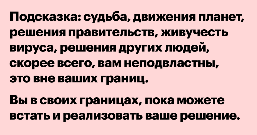 В неспокойные времена очень актуальной оказывается цитата: «Дай мне спокойствие принять то, чего я не могу изменить, дай мне мужество изменить то, что я могу изменить… И дай мне мудрость отличить одно от другого». Потому что именно сейчас самое подходящее время отделить то, что вы реально можете сделать, от того, что вы изменить никак не можете. У психологов это называется «разделить границы».