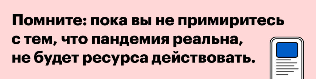 Примите тот факт, что ваша реакция — это совершенно нормально. Основная причина в том, что у нас отсутствует опыт, от которого можно было бы оттолкнуться и понять, как правильно действовать. Последняя пандемия на нашей планете случилась в 1918 году (я имею в виду печально известный грипп «испанка», унесший, по различным подсчетам, от 50 до 100 млн жизней и ставший одной из существенных причин окончания Первой мировой войны), на памяти прабабушек.