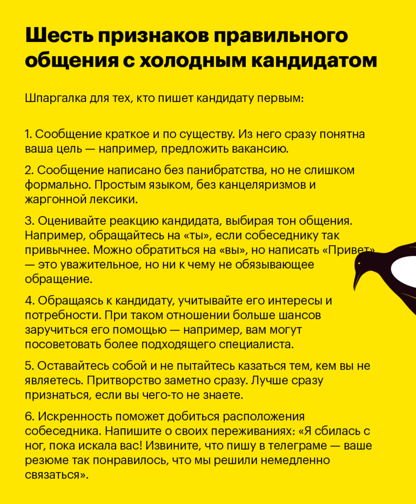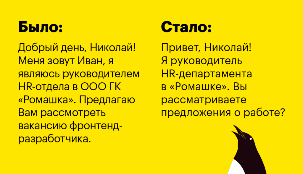 При этом важно соблюдать баланс и не общаться с кандидатом как со своим приятелем. Отталкивайтесь от понимания вашей целевой аудитории, вашей корпоративной культуры, личного комфорта и здравого смысла.