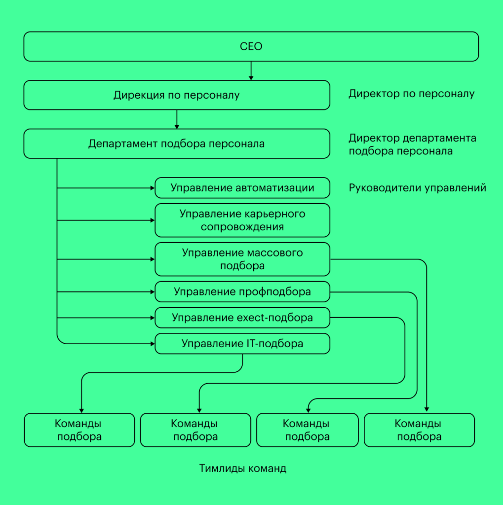 2. Обычно во главе команды рекрутмента стоит тимлид. Если команд подбора несколько, их объединяют в одно подразделение, которым управляет Head of recruitment.