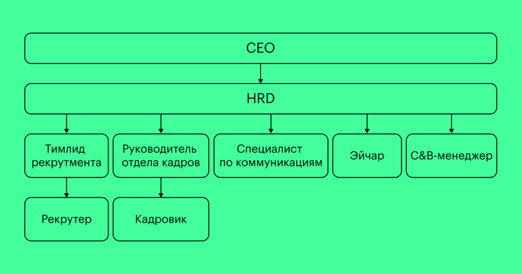 На этом этапе все элементы HR-функции делятся между профильными специалистами. Формируются отделы, каждый из которых отвечает за конкретное направление: подбор, адаптацию, C&B, T&D, внутриком. Внутри эти отделы могут дробиться на еще более мелкие элементы — например, на команды.