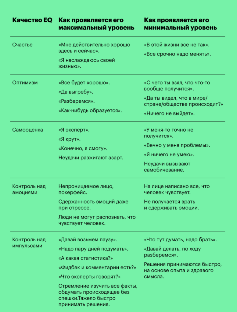 Комплекс из 15 качеств EQ дает человеку понимание, что чувствует он сам и окружающие, чего они хотят и как с ними общаться, чтобы достичь результата.