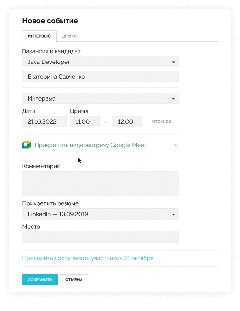 Планируйте интервью в один клик, а Хантфлоу автоматически создаст и добавит ссылку на встречу в Google Meet к событию в календаре.