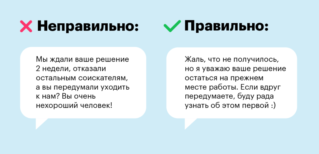 При любом взаимодействии с кандидатом помните: скорее всего, вам еще предстоит вернуться к нему. Не стоит портить отношения сейчас и усложнять себе работу в будущем.