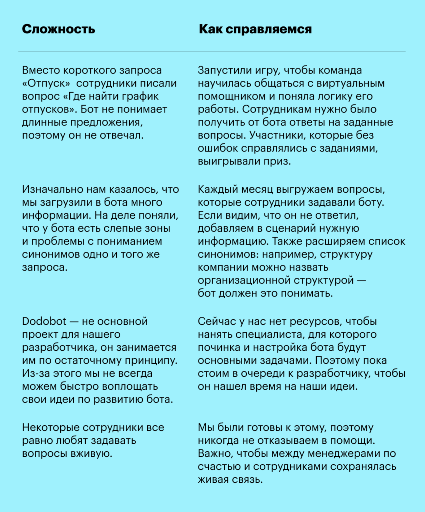 За время разработки, запуска и поддержки бота мы поняли, что учли не все нюансы. Я составила таблицу с главными сложностями и рассказала, как с ними справляемся.