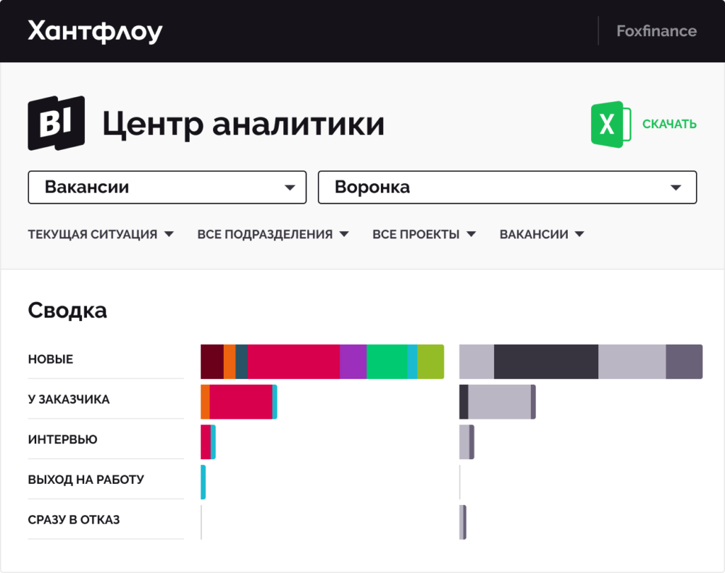 Чтобы вы могли эффективно контролировать и совершенствовать подбор, мы перезапустили платформу отчетов и превратили ее в полноценный центр аналитики. Вся информация у вас под рукой — без погрешностей, в удобной визуальной форме с возможностью мгновенной выгрузки в эксель.