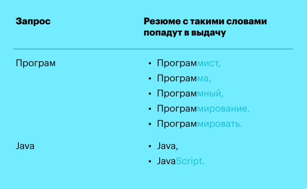 Кавычки помогают находить точные слова и фразы. В Хантфлоу по умолчанию работает оператор * (астериск) — поиск по вхождению справа. Поэтому если запрос не заключен в кавычки, система найдет все резюме со словами, которые начинаются с такой же комбинации букв.
