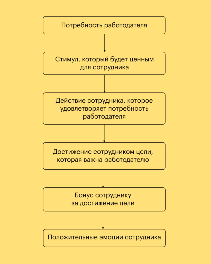 Мотивация рождается там, где внешние обстоятельства могут удовлетворить внутренние желания сотрудников. Она работает по следующему механизму: