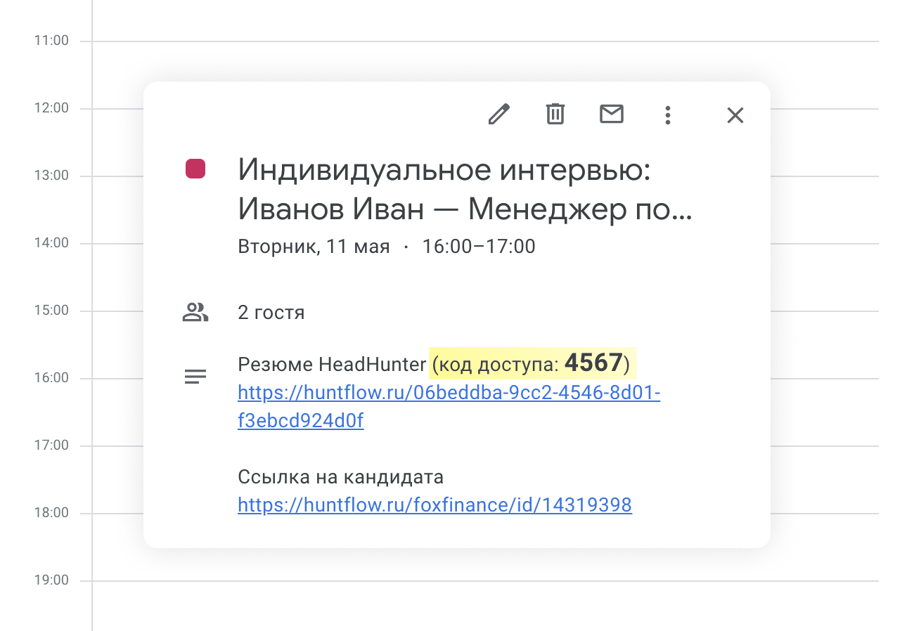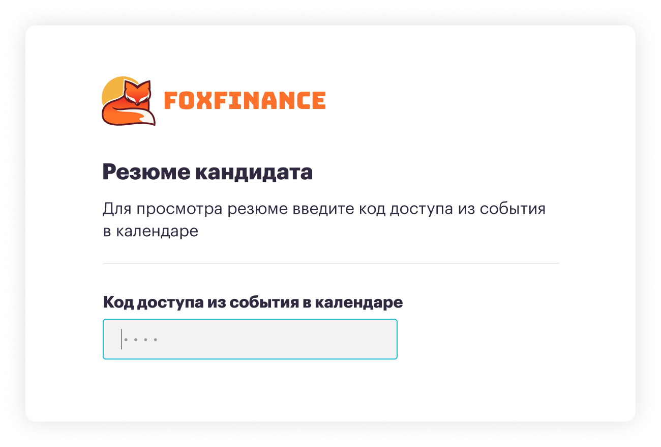 Приглашение на интервью содержит ссылку на резюме кандидата вместе с кодом доступа, который генерируется автоматически. Чтобы посмотреть резюме, нужно ввести код: