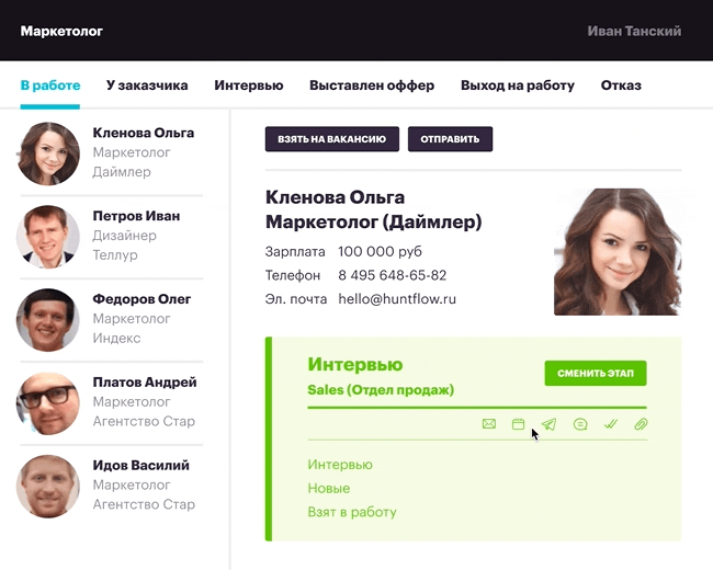 Хантфлоу — профессиональная программа для рекрутинга, которая помогает освободить время рекрутера, систематизировать процесс подбора и автоматизирует формирование отчетности
