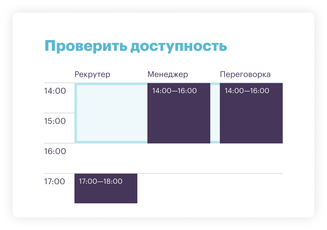 Если на интервью нужно позвать несколько человек, у каждого из которых свой график, организация встречи может превратиться в головоломку. Один участник может, но остальные заняты, а когда все свободны, то переговорка уже забронирована кем-то еще.