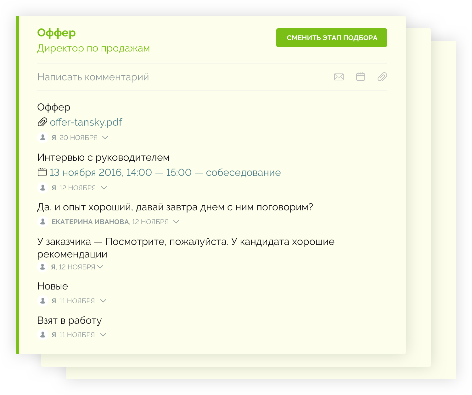 В Хантфлоу все данные, файлы и комментарии хранятся вместе. Выберите нужное резюме и увидите полную историю общения с кандидатом. Никакого хаоса и беспорядка.