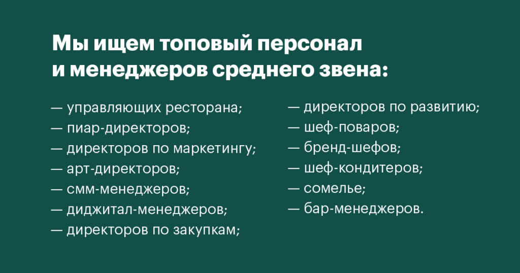 HR-специалистов и директоров по маркетингу — в других сферах. Кандидаты, которые работали только в ресторанном бизнесе, часто ориентируются на узкий сегмент задач, так как основная проблема ресторанов — текучка линейного персонала. В итоге они занимаются решением только этой проблемы и не развиваются в других направлениях.