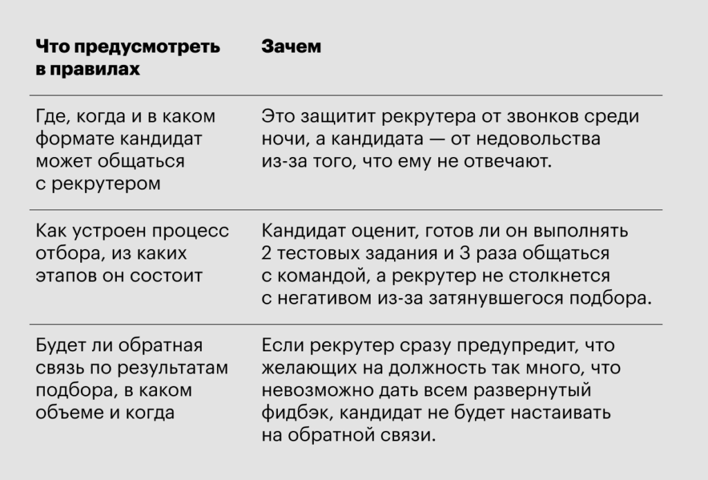 Эти правила не исключают эксцессов: кандидат все равно может не согласиться с решением и повести себя непрофессионально. Тогда договоренности становятся щитом для рекрутера. Он может сослаться на правила и подчеркнуть, что процесс найма прошел как договаривались.