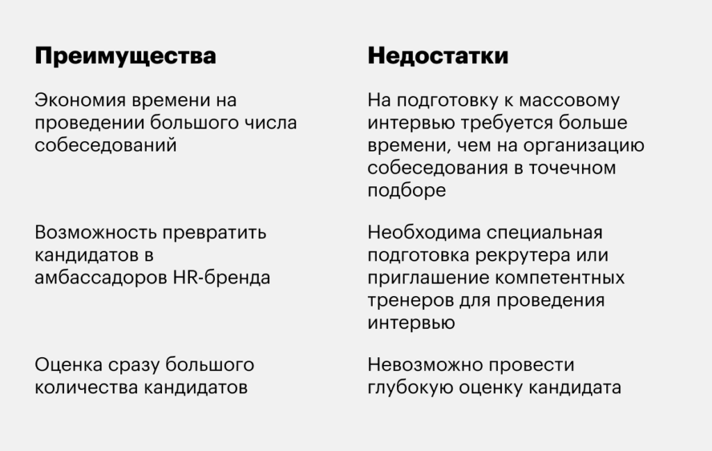Корректно оценить кандидатов во время массового интервью довольно сложно. Людей много, а модели поведения человека в большой группе и в индивидуальных коммуникациях могут сильно различаться. Кроме того, в большой группе нельзя применять методики глубокой оценки — например, проективное интервью.