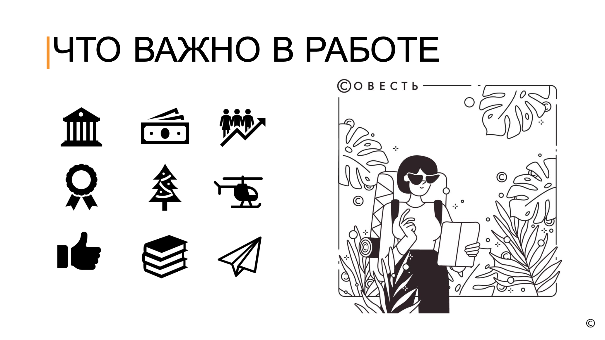 Ведущий предлагает участникам объединиться в группы по 5 человек и написать на флипчарте, что для них важнее всего в новой работе. Обычно все указывают одно и то же: