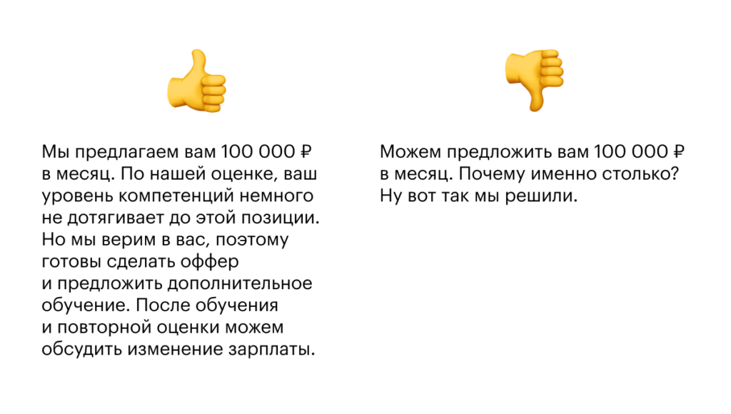 Если вы очень хотите нанять специалиста, но не готовы платить ему столько, сколько он просит, честно расскажите об этом. Еще один залог партнерских отношений — открытость и прозрачность. Важно объяснить и аргументировать кандидату ваш оффер: