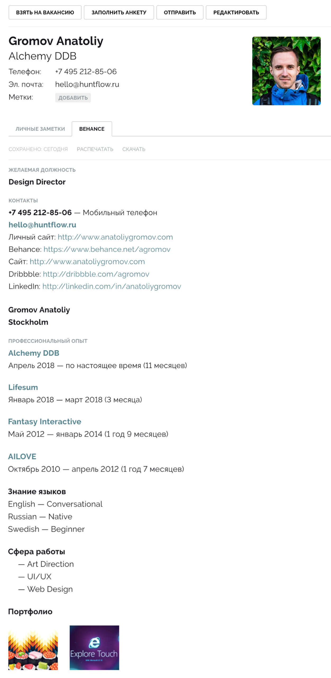 Вся информация о кандидате тоже сохранится в его профиле: контакты, ключевые навыки и места работы. А вы сможете связаться с ним по почте или отправить резюме заказчику прямо из Хантфлоу — все нужные данные будут под рукой.
