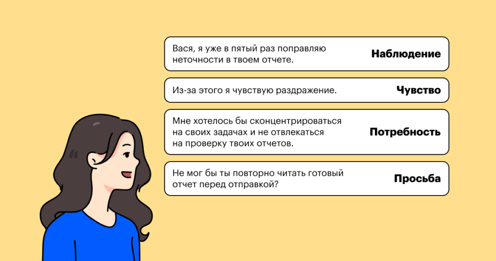 Вот так с помощью концепции ненасильственного общения рекомендуется строить общение с коллегой: