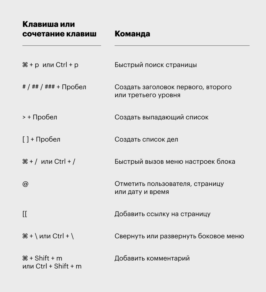Шорткаты — это клавиши или сочетания клавиш, которые позволяют быстро выполнить определенную команду. Вот самые нужные шорткаты для работы в Notion: