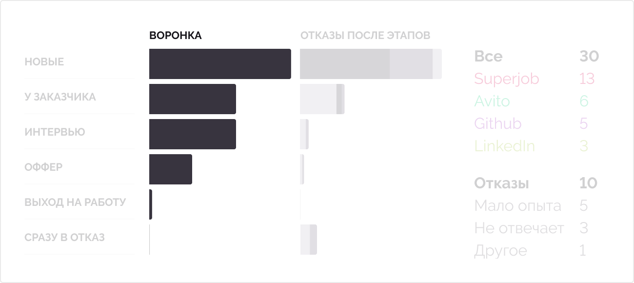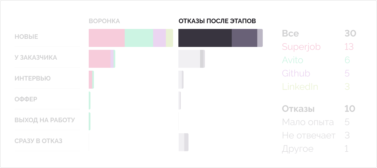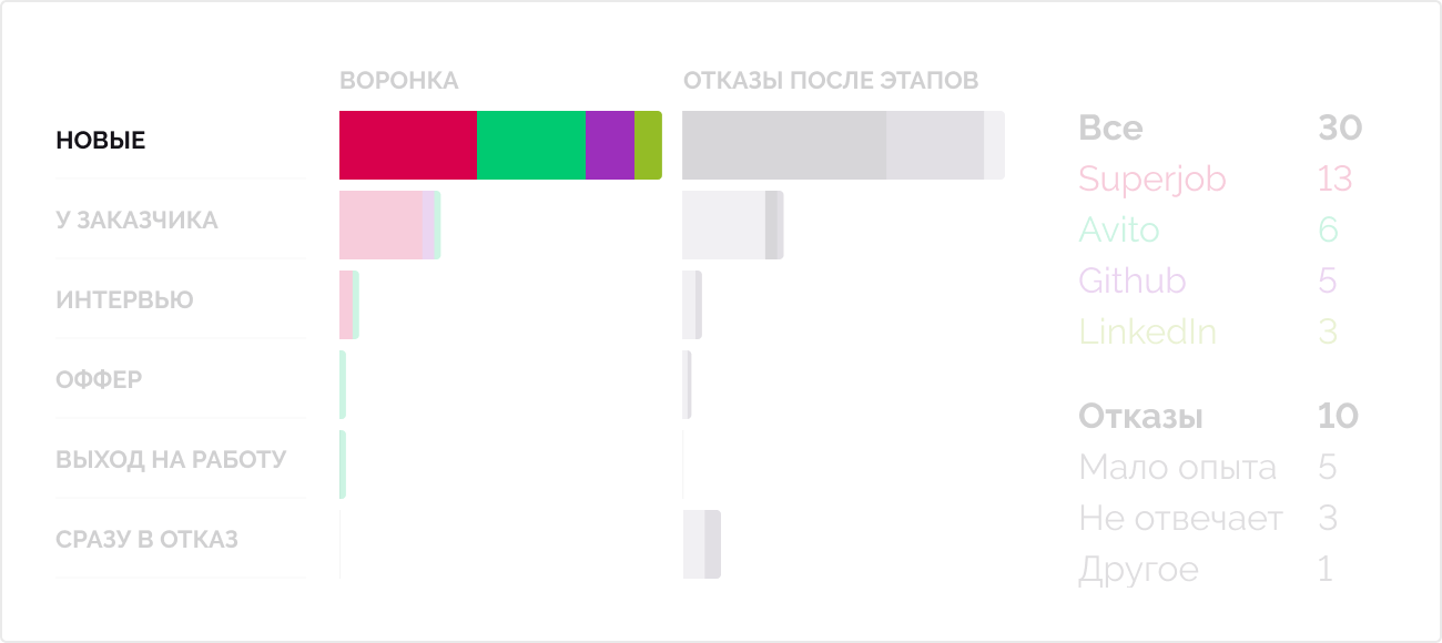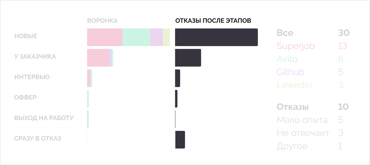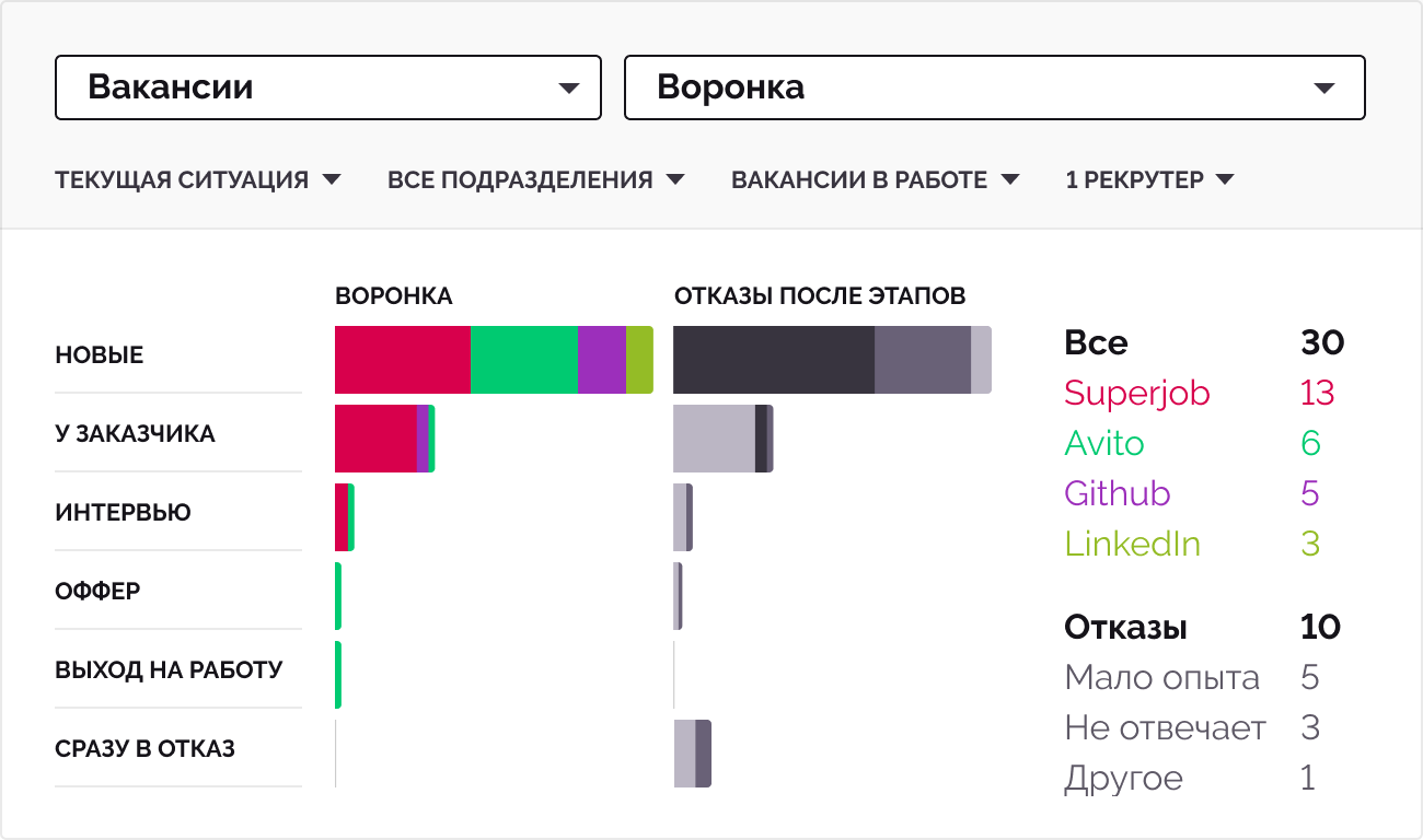 Обычно рекрутинговые программы плохо помогают анализировать рекрутинг с помощью визуализации. Воронка рисуется в виде ненастоящей воронки: без чтения чисел невозможно оценить эффективность подбора, а разные показатели находятся на разных страницах: