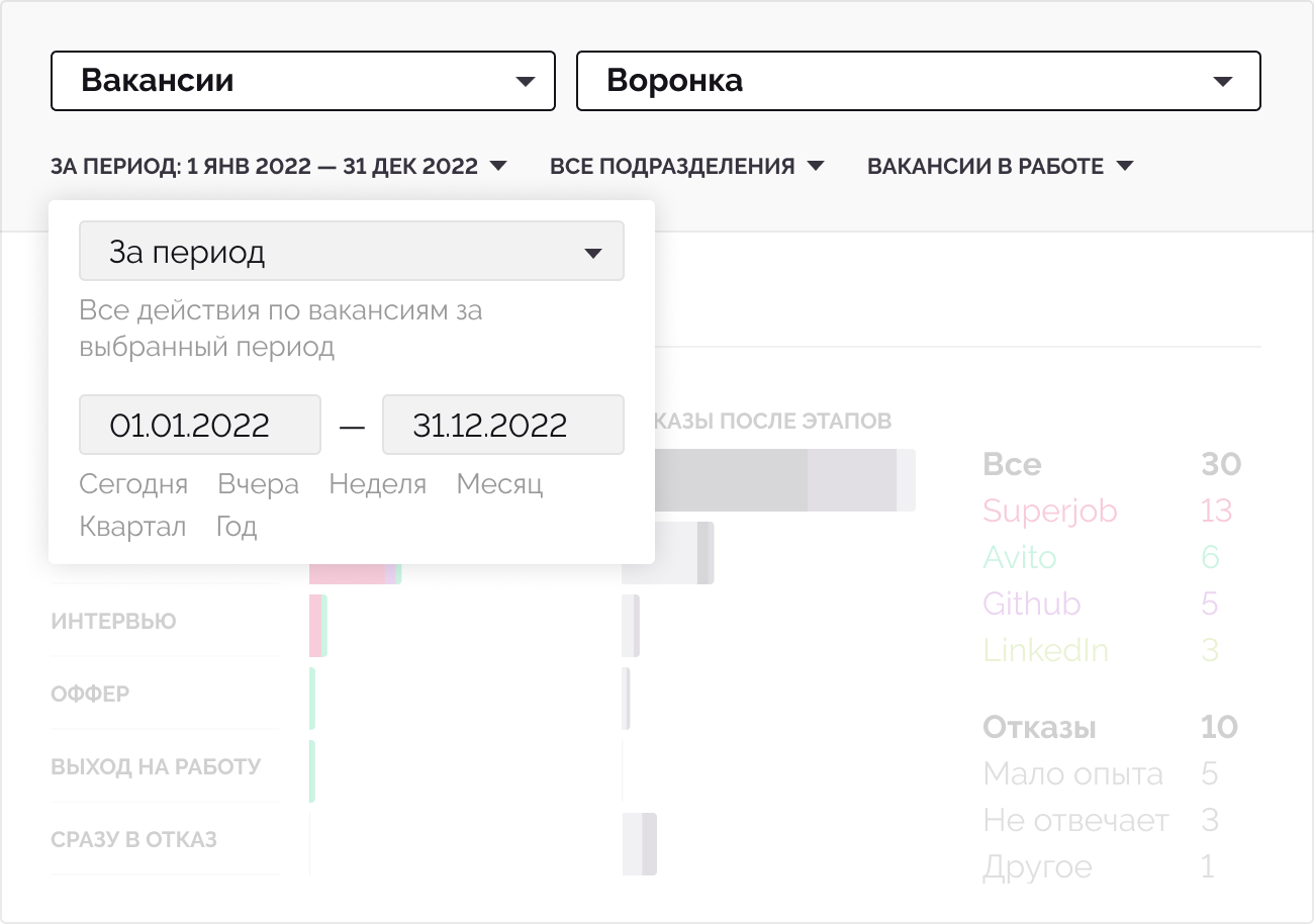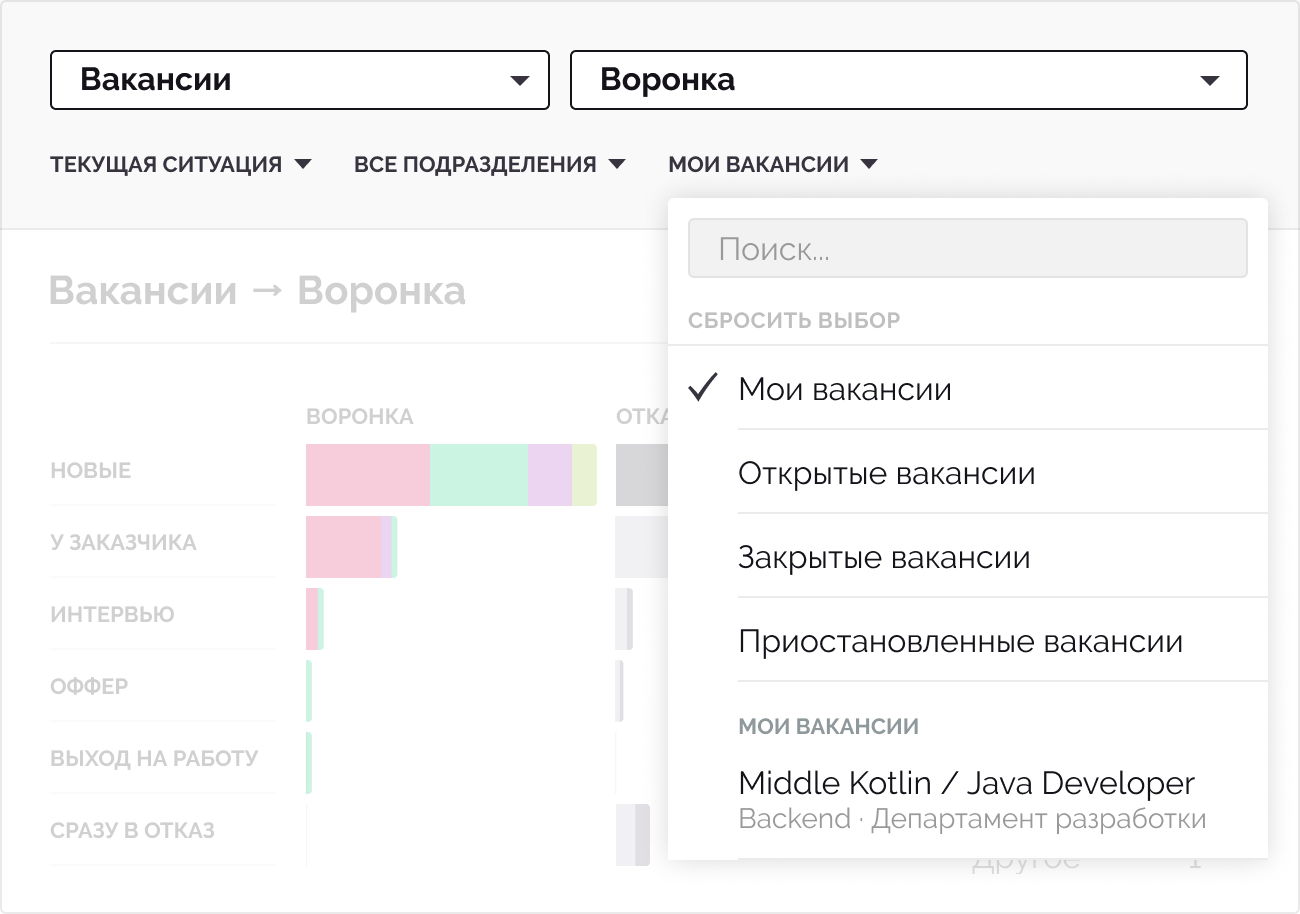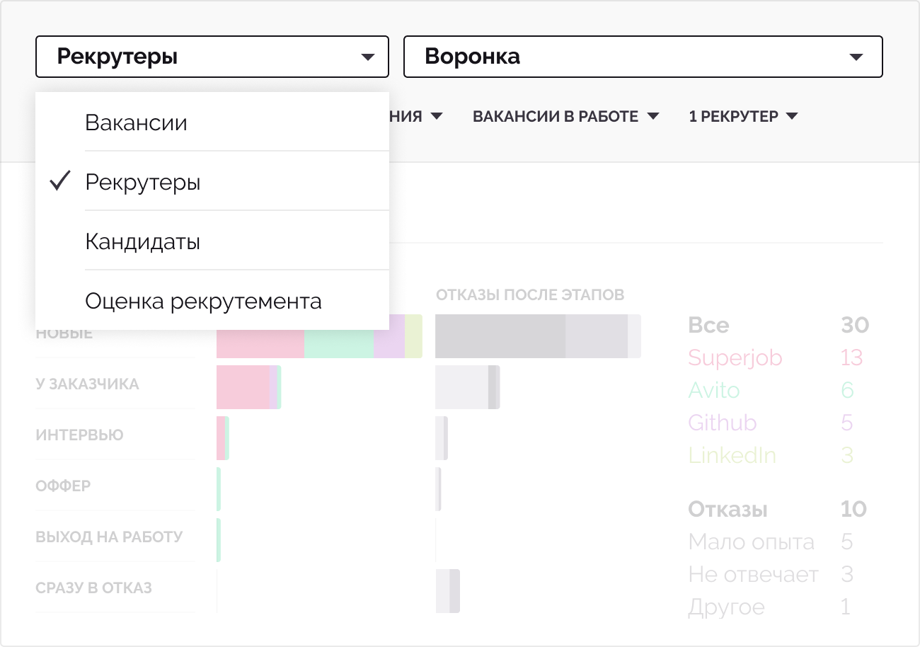 Анализируйте воронку не только в разрезе вакансий, но и в разрезе рекрутеров. Удобно, когда нужно оценить эффективность каждого рекрутера.