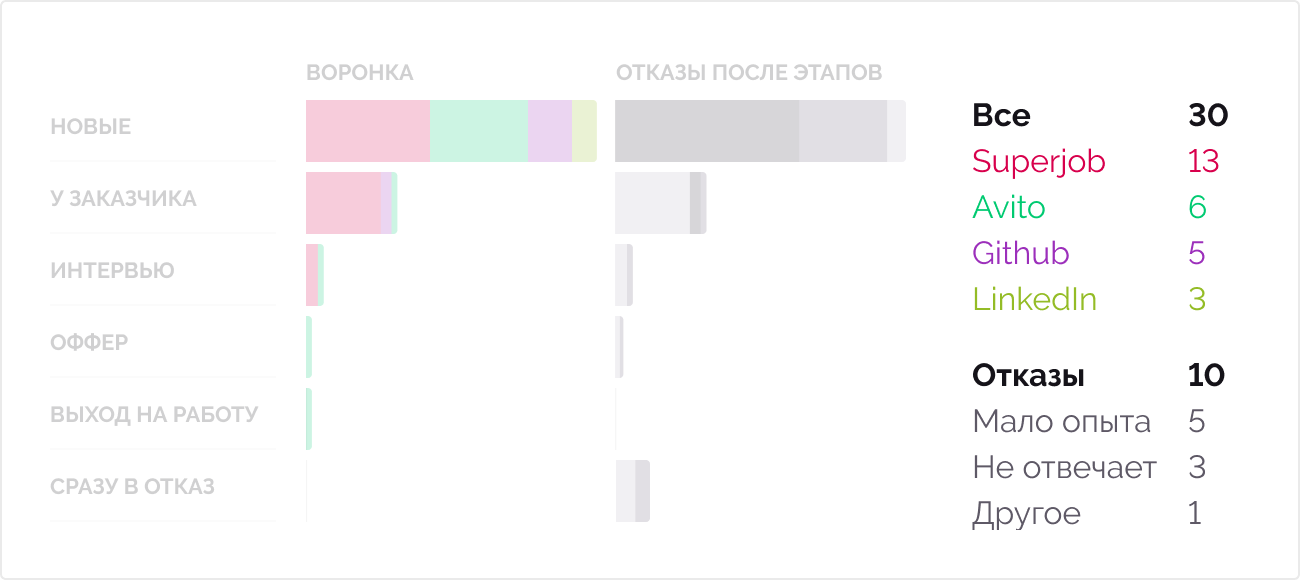 В правой части визуализация показывает, скольким кандидатам вы отказали (или они отказались сами) после каждого этапа. Это позволяет увидеть, после какого этапа «отваливаются» большинство кандидатов: