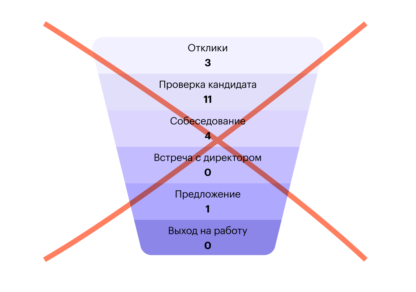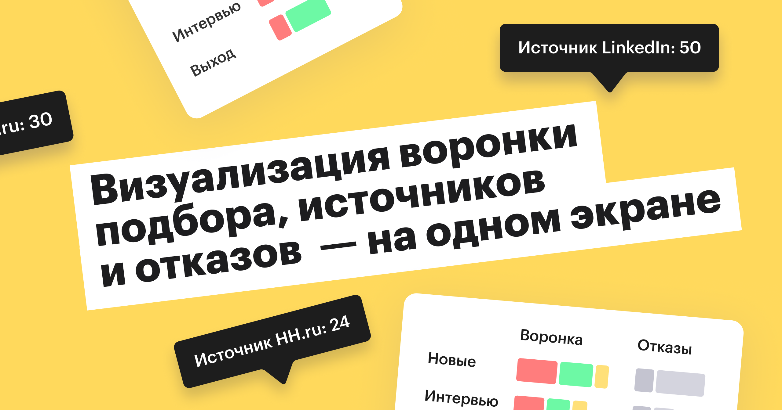 Обычно рекрутинговые программы плохо помогают анализировать рекрутинг с помощью визуализации. Воронка рисуется в виде ненастоящей воронки: без чтения чисел невозможно оценить эффективность подбора, а разные показатели находятся на разных страницах: