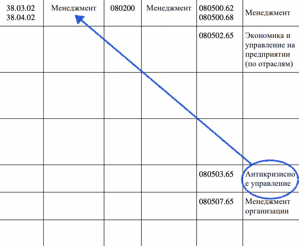Многие специальности со временем поменяли свои названия и коды — это не так важно. В приложении к приказу Минцифры установлены соответствия между старыми и новыми специальностями. Например, раньше специальность называлась «Антикризисное управление» (код 080503.65), а теперь — «Менеджмент» (код 38.03.02 или 38.04.02). В заявлении на отсрочку нужно будет указать актуальное название — найдите его по таблице. О заявлении подробнее расскажем ниже.