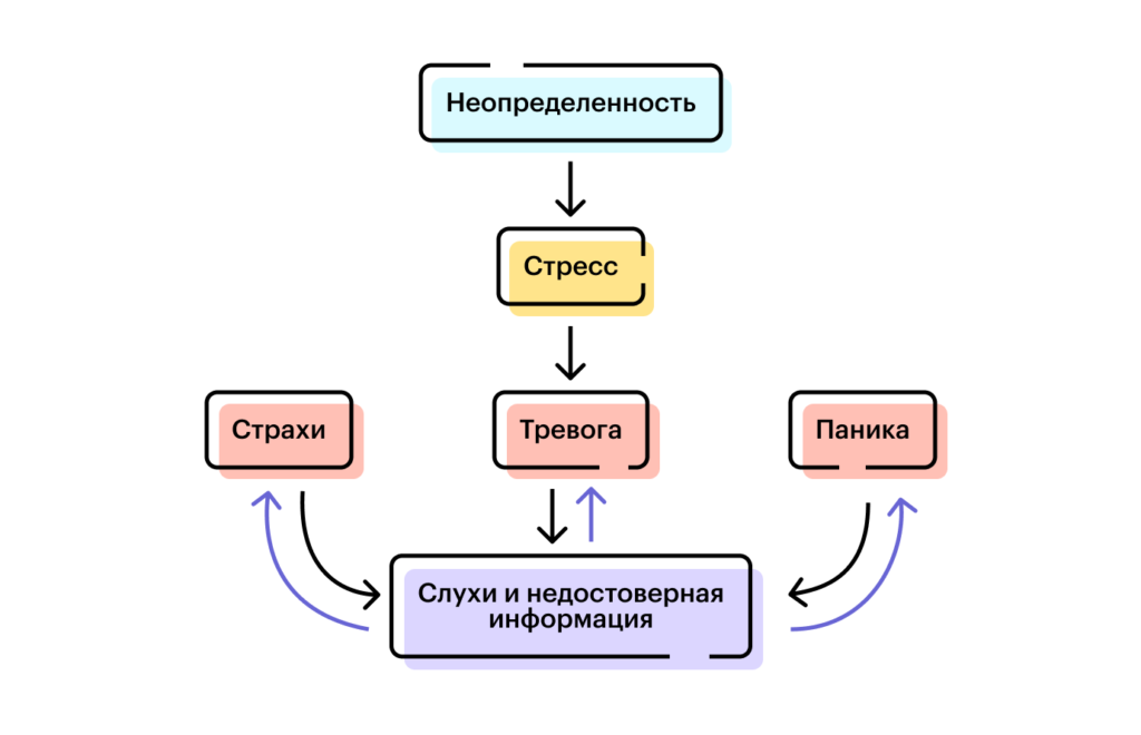Неопределенность вызывает наиболее сильный стресс. Этот стресс порождает страхи, тревожность и панику. Тревожные настроения создают слухи и спекуляции, которые еще сильнее подогревают панику. Это буквально порочный круг: