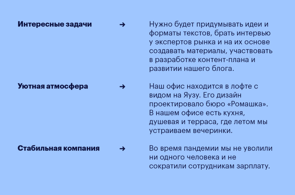«Интересные задачи», «уютная атмосфера», «стабильная компания» скорее оттолкнут кандидатов. Подумайте, что за подобными фразами скрывается в вашей компании, и опишите это: