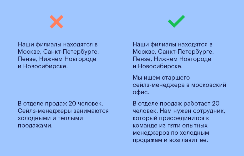 Из описания вакансии кандидат больше всего хочет точно понять, какими будут именно его задачи и условия работы. Цель хорошо описанной вакансии — избавить кандидата от страха неизвестности: новый сотрудник придет в незнакомую ему среду, поэтому нужно постараться в деталях описать все, что будет касаться его работы.