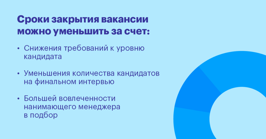 Иногда удается уменьшить срок закрытия путем повышения вовлеченности заказчика в подбор. Например, мы предлагаем: «Найдем не за 40, а за 20 дней. Но тогда тебе придется сильнее вкладываться в этот процесс: потратишь не 8 часов, как обычно, а 16. Придется проводить в два раза больше интервью и в два раза быстрее давать фидбек. Пойдет?»