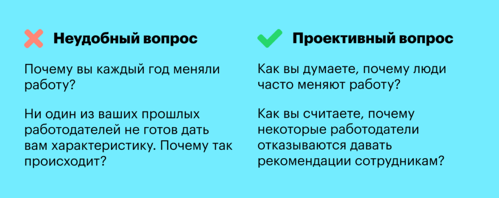 Более мягко задать неудобный вопрос. Люди не любят говорить на неприятные темы. Чтобы скрыть правду, они замыкаются, теряются или обманывают. Отвечая на проективный вопрос, кандидат говорит не о себе, поэтому испытывает меньше неприятных чувств.