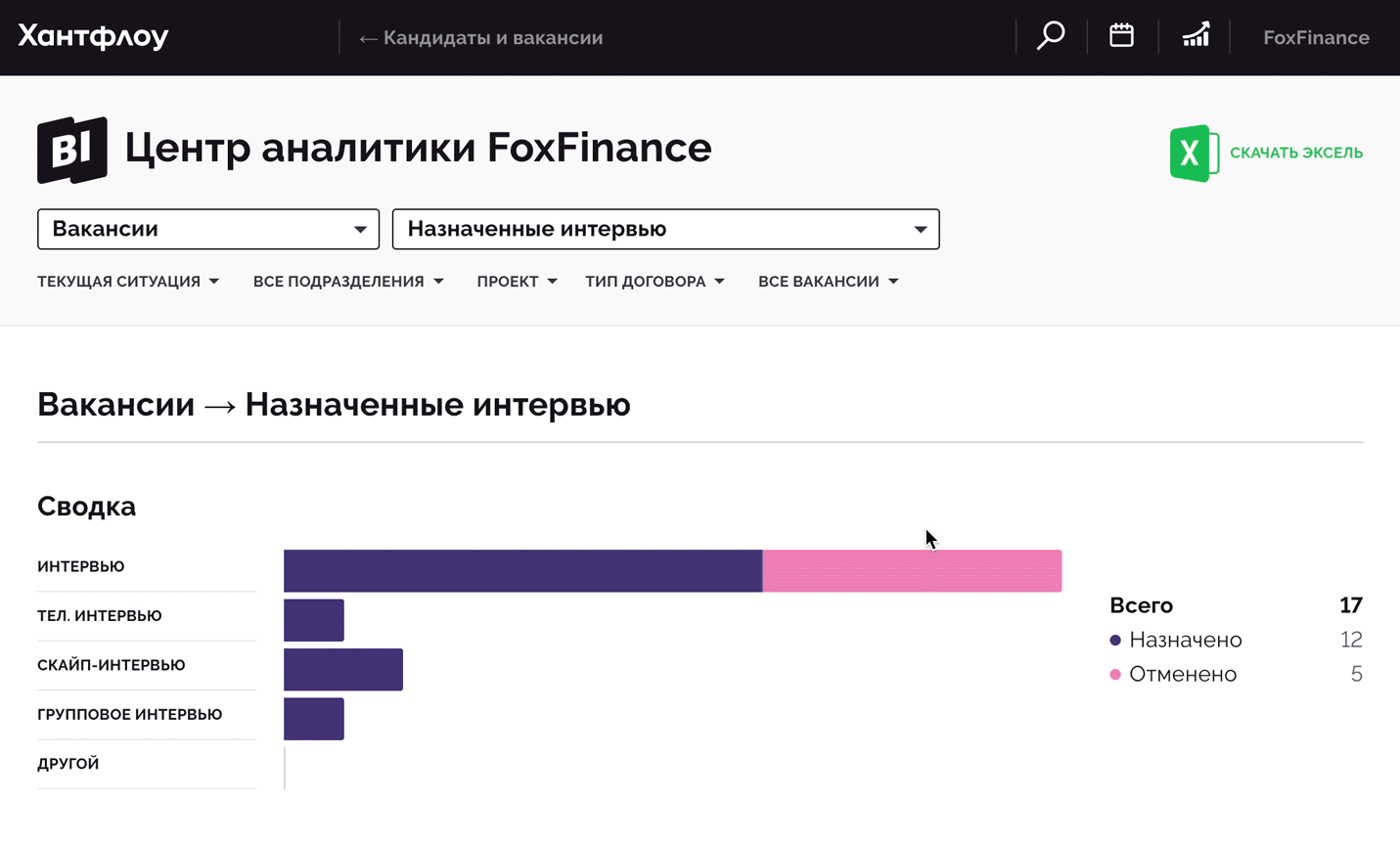 Например, посмотрим на кандидатов, которые не пришли на встречу. Это можно сделать в один клик: