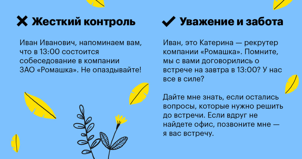 Если кандидат востребован и у него много предложений, он запросто может запутаться в них. Вы пригласили его сегодня на двенадцать, а он был уверен, что встреча — завтра в час.