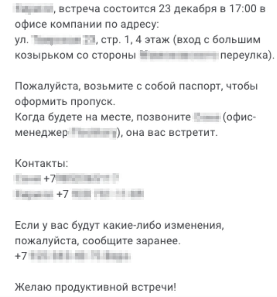 Рекомендую учесть даже мелкие детали. Например, если на входе в офис сидит строгий охранник и просит у посетителей документы, то письменно предупредите соискателя, чтобы взял с собой паспорт. На случай, если кандидат все равно заблудится, укажите контакты человека, который встретит его или сориентирует по телефону.