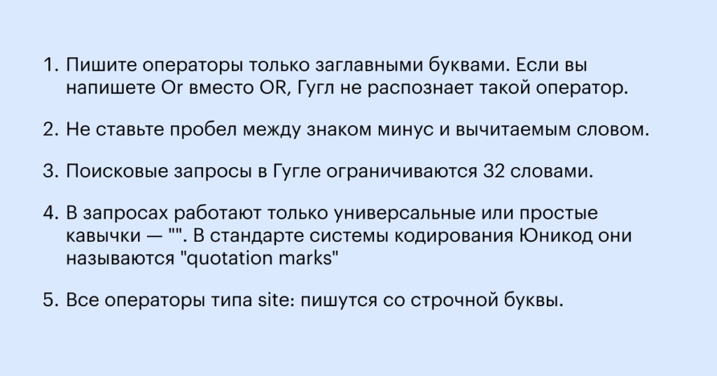 Для поиска в Гугле можно использовать и ряд других операторов: