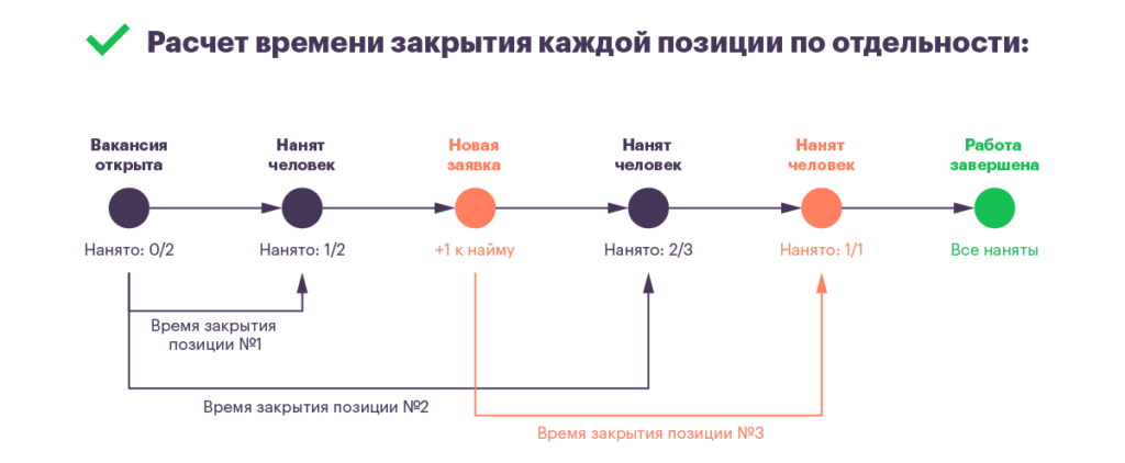 Срок закрытия позиции — период от начала до окончания работы с заявкой. Вы можете сами выбрать, что считать финальным этапом, но обычно это принятие оффера либо выход нового сотрудника на работу.