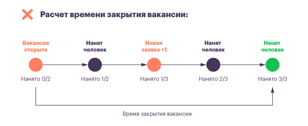 Например, рекрутер начал искать сотрудника, а потом пришел заказчик и сказал, что планы изменились: надо нанять не одного, а троих. Если считать срок закрытия такой вакансии от ее открытия до найма по всем позициям, то получится бесполезное и недостоверное значение. Более того, вакансия может никогда не закрываться, если заказчики подкидывают в нее все новые позиции.