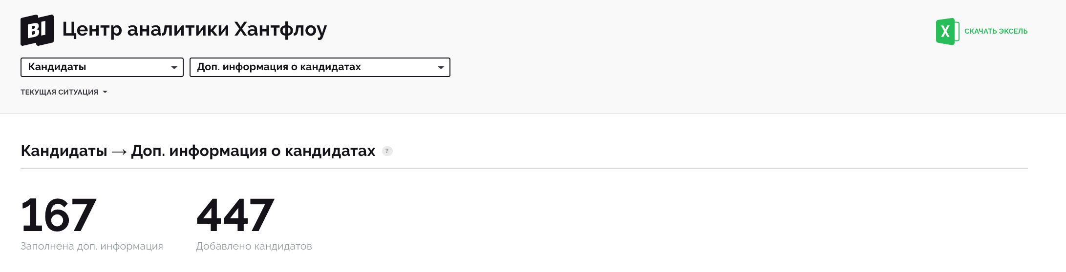 Отчет позволяет выгружать дополнительные сведения о кандидатах в формате, пригодном для аналитики. Визуальная часть отчета в Хантфлоу показывает: