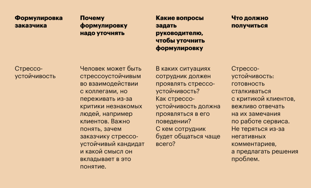 Можно встретиться в офисе или созвониться в зуме — формат неважен. Главное — уточнить формулировки из шаблона, который заполнил заказчик. По моему опыту, мало кто заполняет все поля идеально: часто в требованиях встречаются абстрактные формулировки вроде «стрессоустойчивость» или «коммуникабельность».