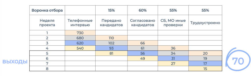 Допустим, надо нанять 70 сотрудников колл-центра. План демонстрирует, что на это уйдет минимум 2 месяца:
