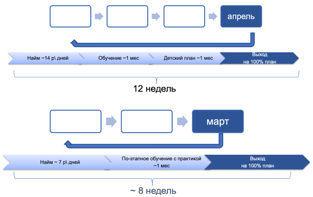 Раньше сотрудники выходили на эффективность в среднем за 3 месяца, с учетом времени на закрытие вакансии. Мы сократили этот срок до 2 месяцев благодаря ускорению найма и изменению процесса адаптации.