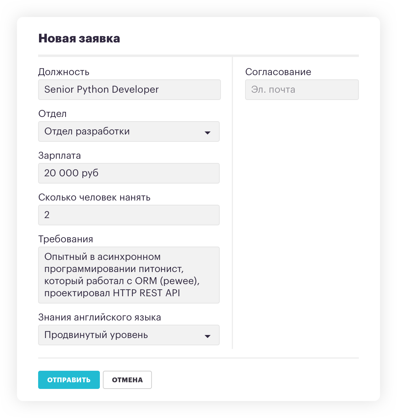 Пришлите вашу форму, и мы бесплатно внедрим ее в Хантфлоу. При необходимости создадим несколько вариантов — для разных категорий вакансий. Добавим любые поля: отдел, куда нужен сотрудник, уровень зарплаты, требования, знание языков, электронная почта человека, с которым нужно согласовать заявку. Ключевые поля можем сделать обязательными — заявка не отправится, пока заказчик их не заполнит.