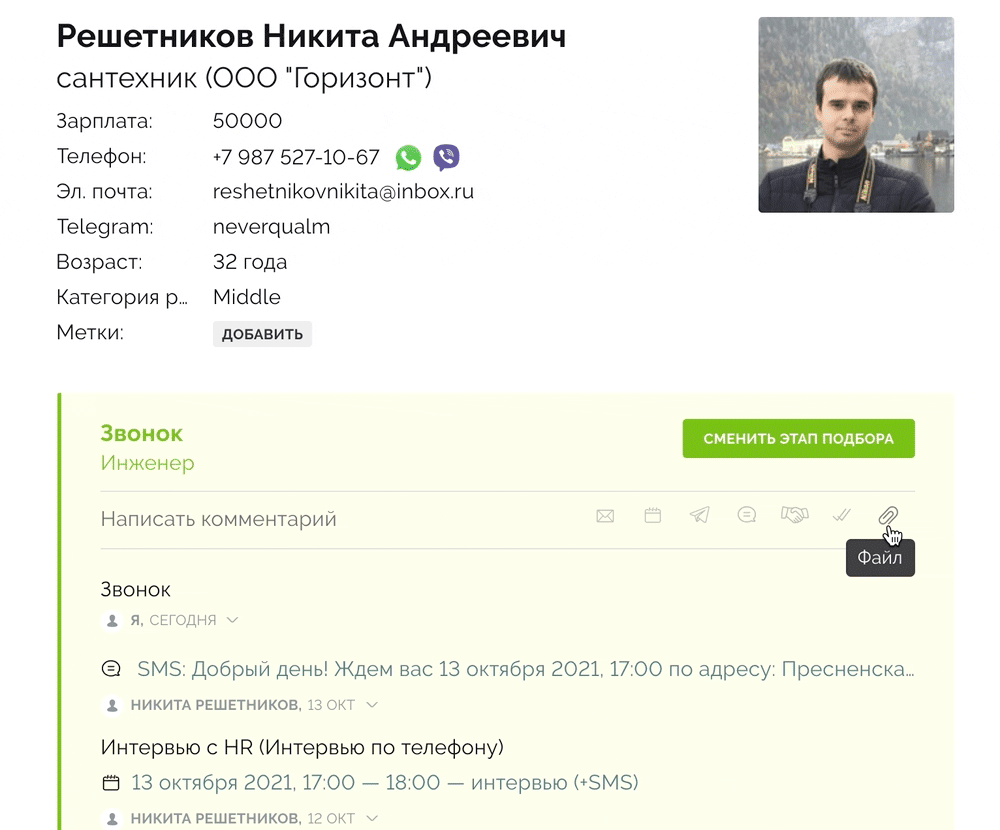 Допустим, рекрутер переводит кандидата на этап «интервью с нанимающим менеджером». Параллельно надо добавить встречу в календарь и сообщить о ней заказчику и кандидату. Все это можно сделать парой кликов из одного окна — никуда переходить не придется.